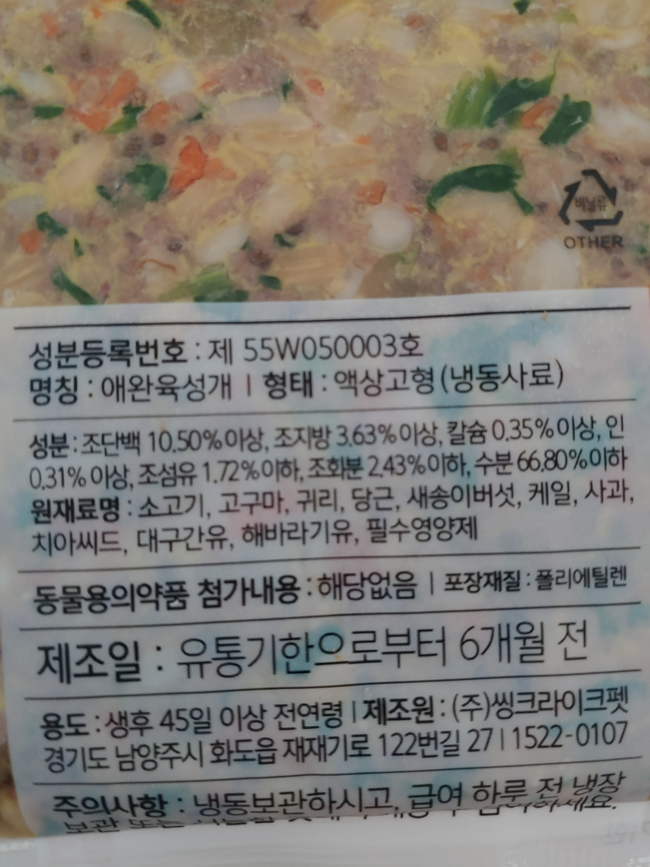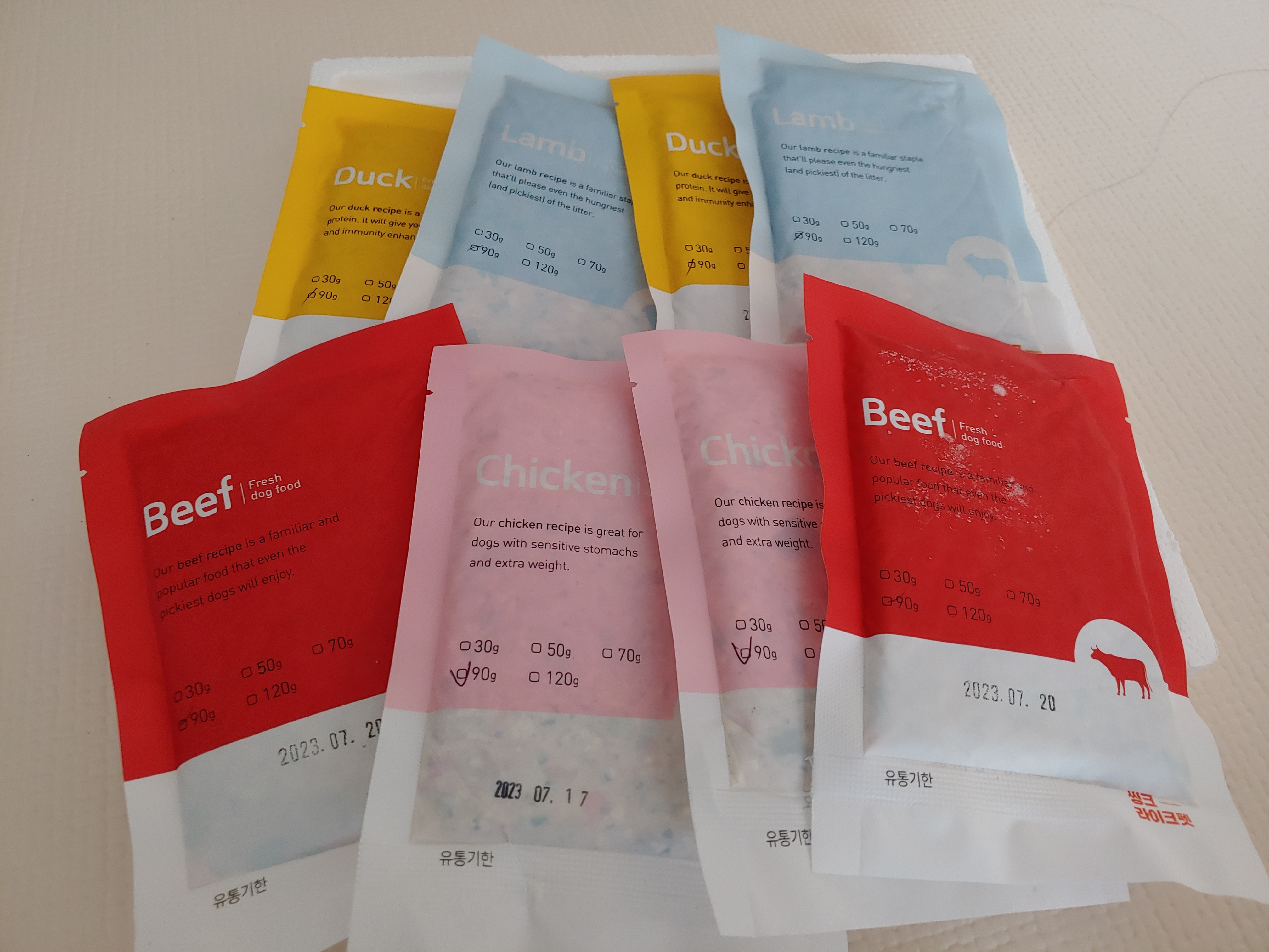 습식사료라 택배가 도착하면 바로 '냉동'보관하셔야 합니다. 급여 하루 전에 냉장고에 넣어두시거나 서늘한 곳에 놔두시면 됩니다. 저는 하루 전에 냉동실에서 꺼내어 냉장고에 보관합니다. 다음 날 간사료+씽크라이크펫 사료+ 따뜻한 물 + 간약을 섞어 급여합니다. 약이랑 섞어서 먹여도 너무너무 잘 먹으니 참고해 주세요^^