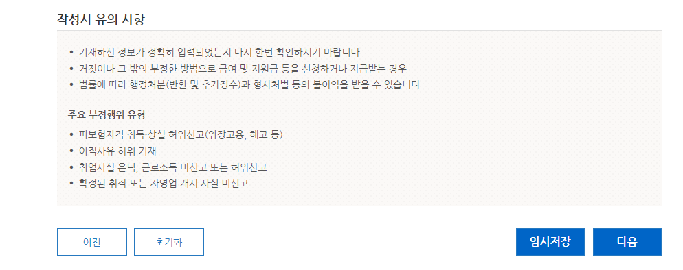 3. 본인의 실업정보와 체크해야 부분들이 나옵니다. 스크롤을 아래로 내리면 아래 부분이 나옵니다. 모두 '아니요' 체크'하신 후 '다음'을 눌러 넘어가주세요