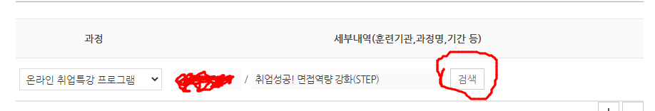 위 항목까지 하셨나요? 그럼 아래에 보이는 '검색' 부분을 클릭 후 자신이 들은 교육과정을 찾아주세요!