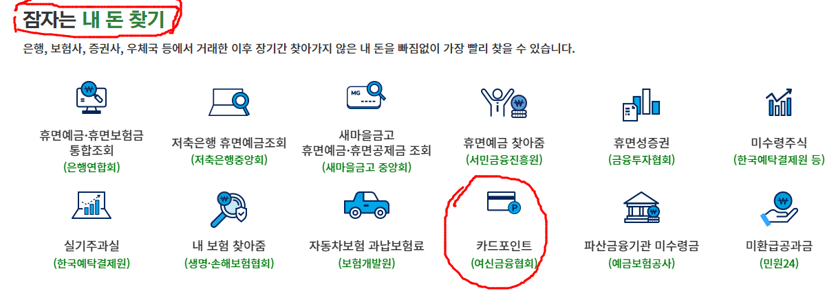 2. '잠자는 내 돈 찾기'가 보이실거예요. 거기에서 '카드포인트' 들어가셔서 조회하시면 됩니다.
