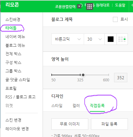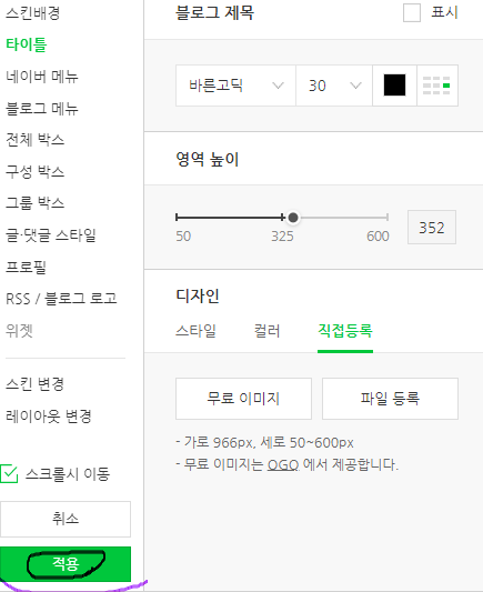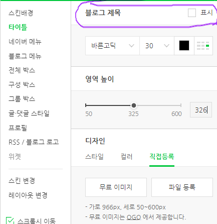 6. 자신이 만든 '블로그스킨'을 불러와주세요!! 사이즈가 안맞을 거예요. 사이즈를 '326'으로 변경해주셔야 합니다.