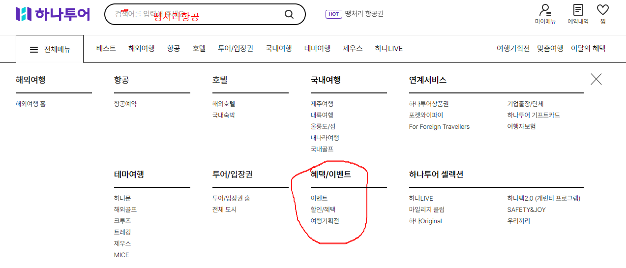 검색창에 '땡처리항공권' 이라고 검색하시거나 할인/인벤트 항목을 활용하시면 된답니다. 그리고 원하는 항공편 예매하세요^^
