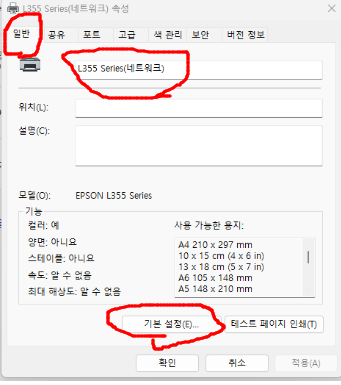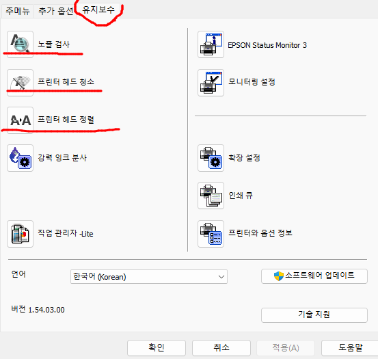 프린터 설정 -> 프린터 속성 -> 기본 설정 -> 유지보수로 들어가 주세요. 그 후 아래 빨간색 부분을 차례 차례 진행해주세요!