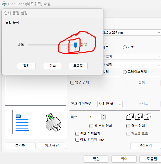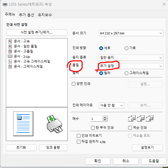 프린터 설정 -> 프린터 속성 -> 기본 설정 -> 유지보수로 들어가 주세요. 그 후 아래 빨간색 부분을 차례 차례 진행해주세요!