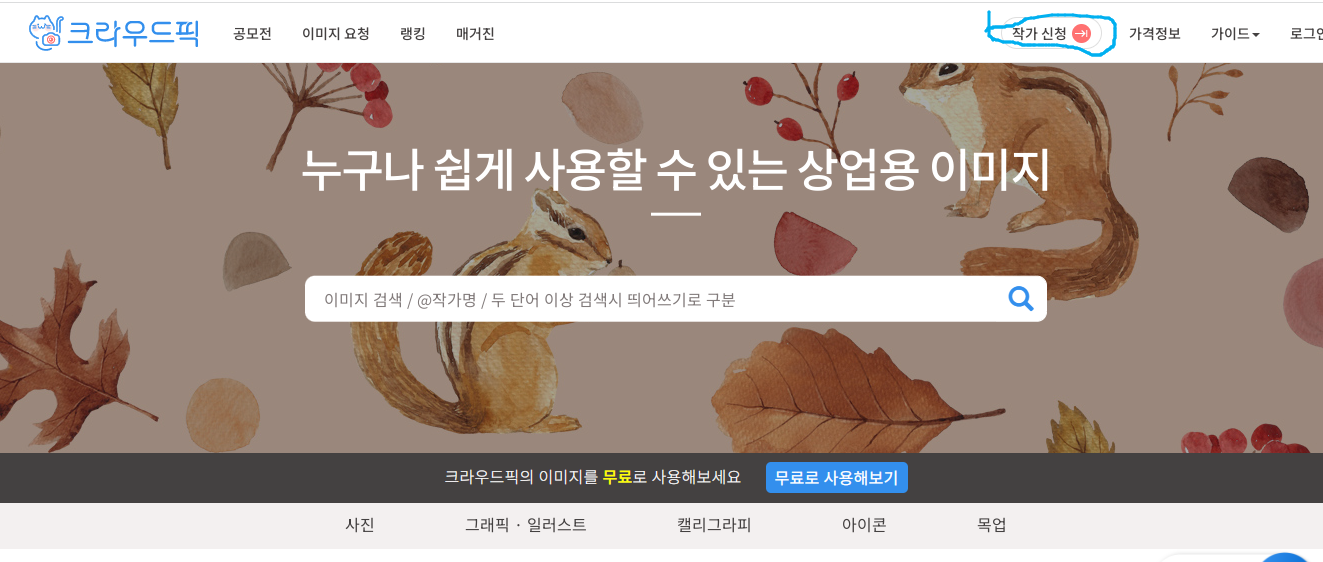 먼저 크라우드픽 들어신 후 '작가신청'을 해주세요. '이미지 업로드' 부분이 보이실거예요. 그 부분 클릭하신 후 사진 올리고 사진에 대해 설명만 해주시면 됩니다. 참 쉽죠?^^