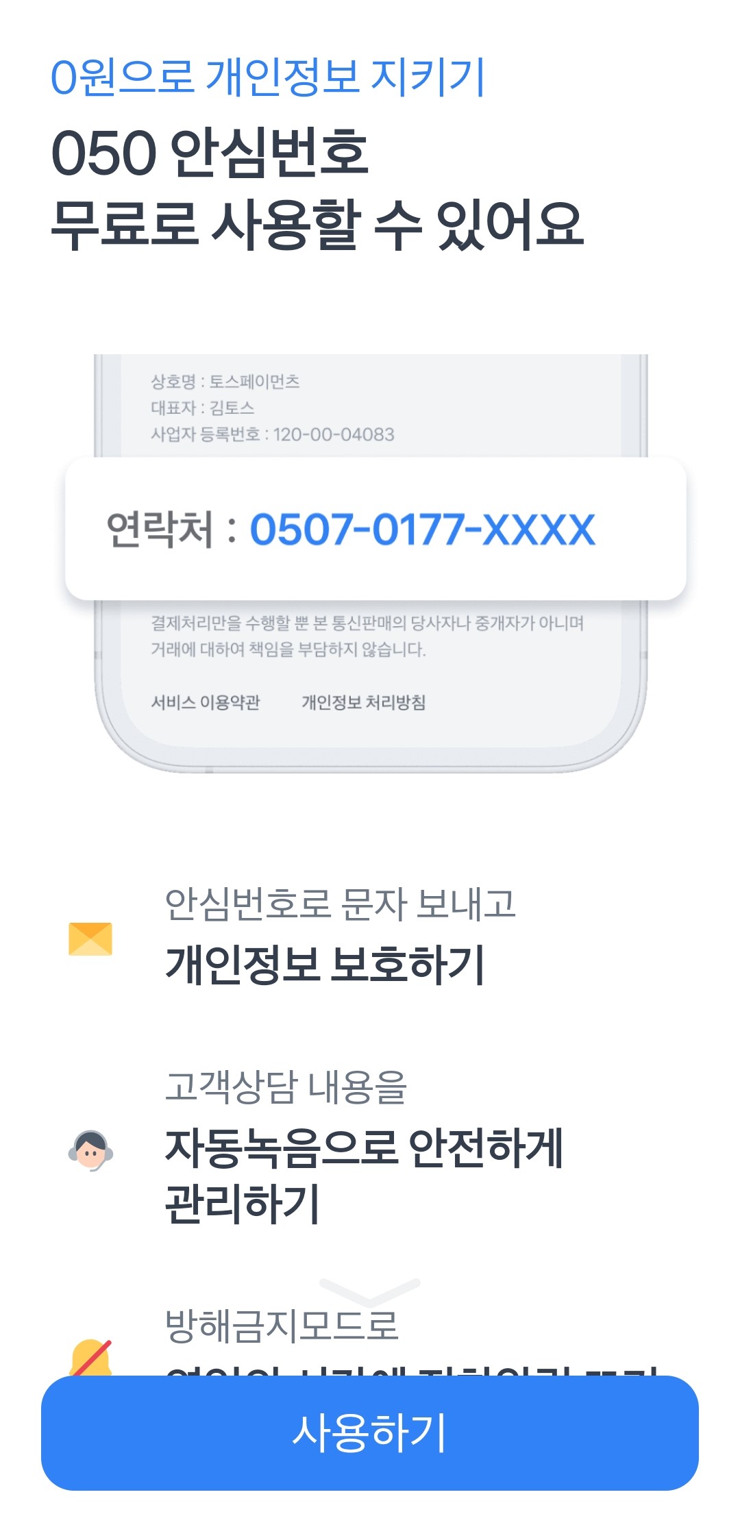 토스비즈니스 가입이 되었으면 '안심전화번호 연결'을 해주셔야 합니다.