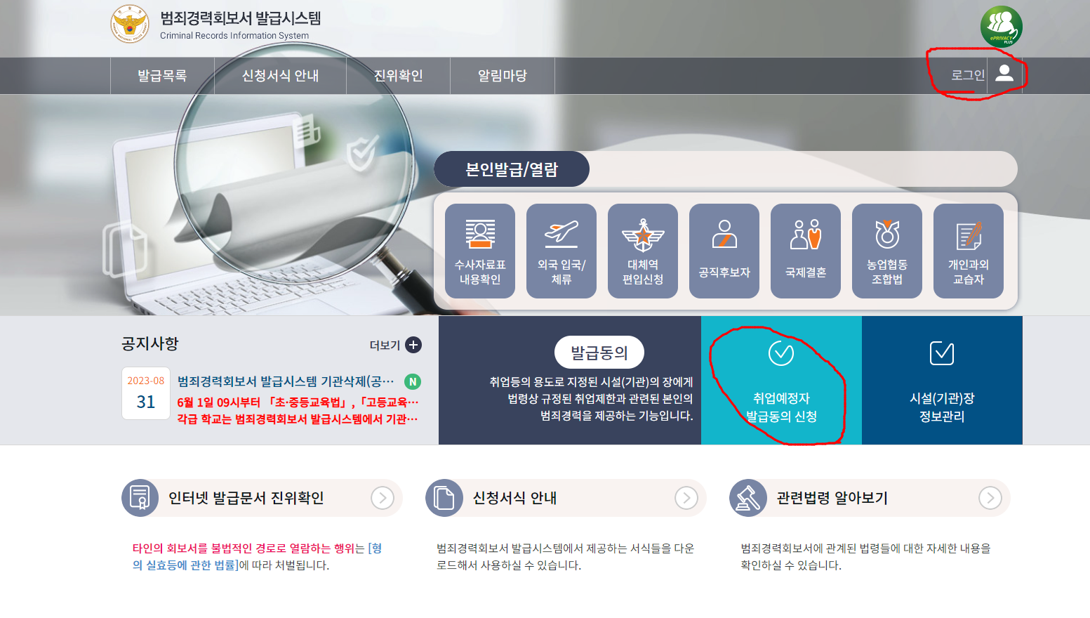 2. 사이트 들어가셨나요? 이제 '로그인' 클릭, '취업예정자 발급동의 신청' 클릭 해주세요