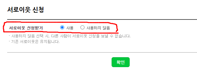 서오이웃 신청을 받지 않을 때는 '사용하지 않음'을 클릭 후 확인을 눌러주세요. 이 경우 '이웃' 신청만 받을 수 있게 된답니다.