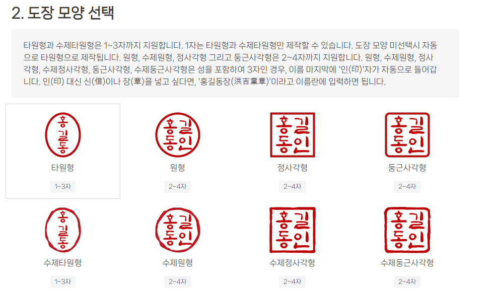 * 이름 입력 칸에 '홍길동'이라 치시면 아래 이미지처럼 이름이 보입니다. 네모, 동그라미 등 마음에 드는 도장 모양을 클릭하시면 선택이 됩니다.