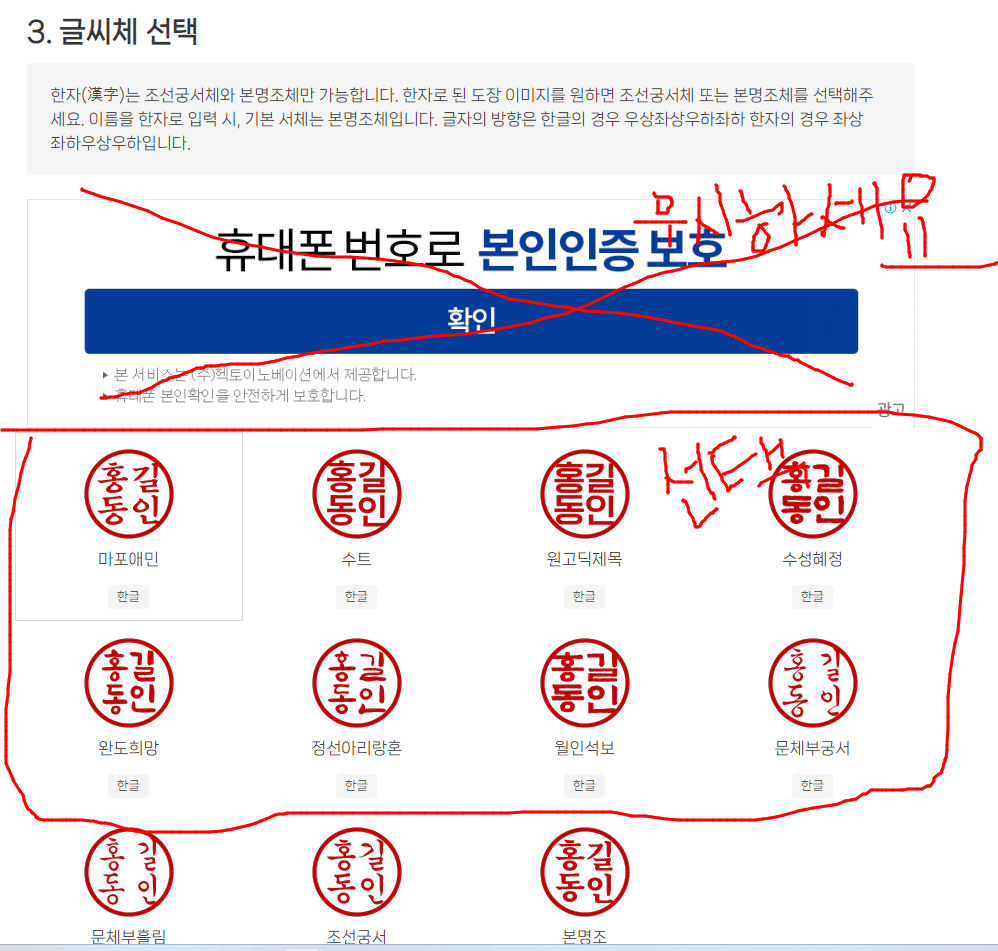 * 3단계 '글씨체'를 선택해주세요. 다른 거 신경쓰지 마시고 그냥 도장에 보이는 글씨체만 클릭해서 선택하시면 됩니다.