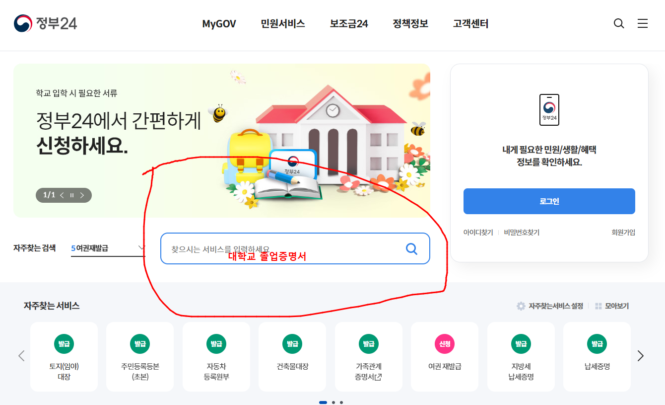 2. 검색창에 '대학교 졸업증명서' 입력 후 엔터