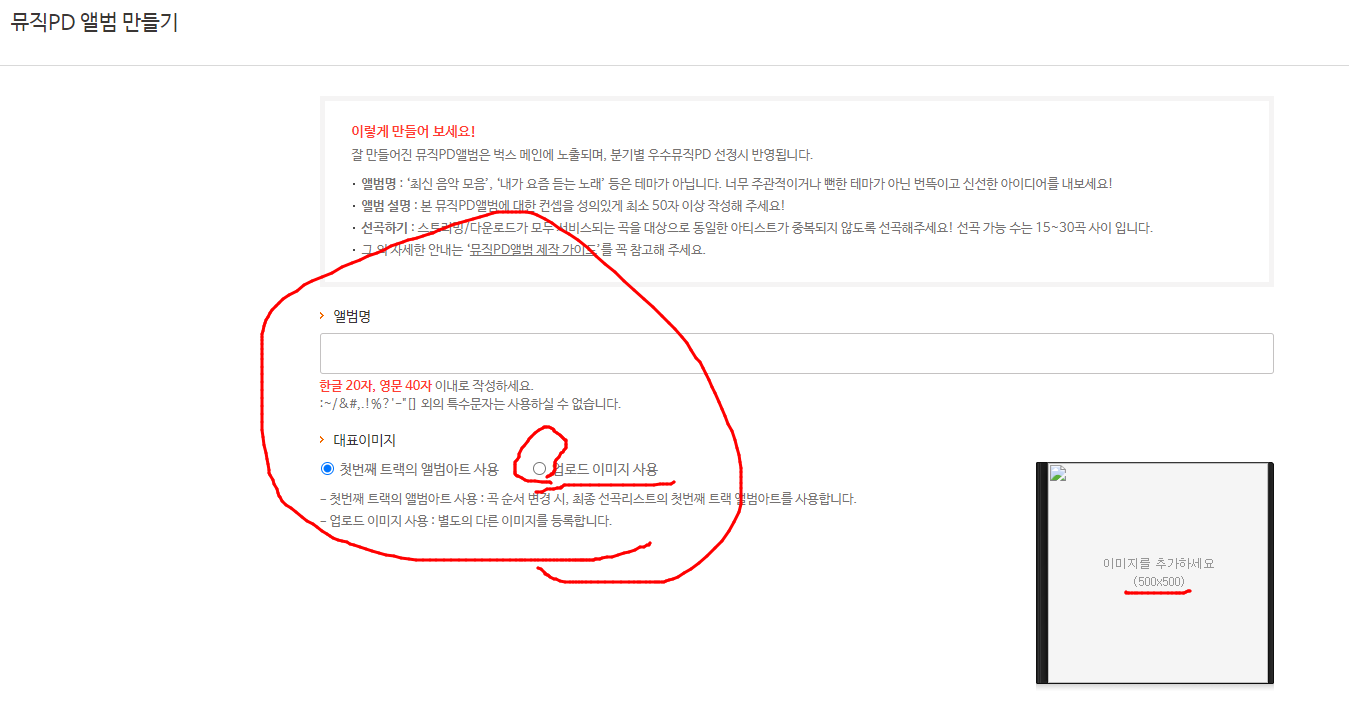1. 앨범이미지(500x500)를 어떻게 하지 선택해주세요